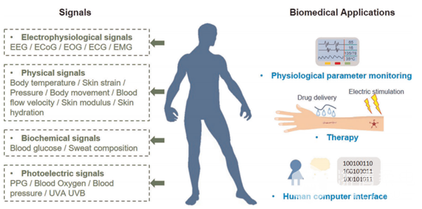 圖1. 柔性生物電子器件貼附至人體不同(tóng)部位可采集的信號及相關應用