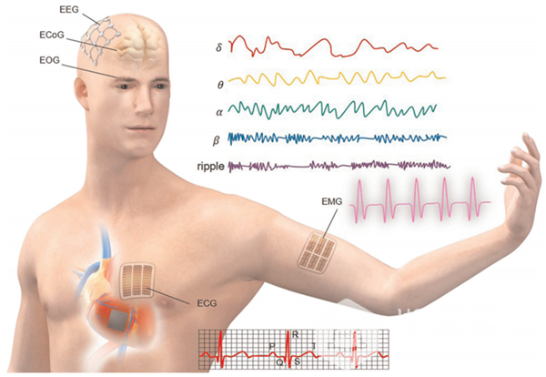 該綜述文章從(cóng)柔性無機生物電子器件與柔性有機電子器件的對比出發,簡要總結了柔性無機生物電(diàn)子(zǐ)器件的材料設計、結構優化以及與之匹(pǐ)配的加工製備(bèi)工藝,係統闡述(shù)了其在生物醫學(xué)工程中重要應用前景。文章將人體生理信號分為三大類:(1)生理電信(xìn)號,包括(kuò)頭皮腦電信號(EEG),皮層腦電信號(ECoG),外周神經電信號(hào),心電(EEG),肌電(EMG)和眼電(EOG);(2)生物物理信號,包括人體的體溫、應變、壓力等信號用於基礎健康信息(xī)診斷;(3)生物(wù)化學信號,包括血糖,以(yǐ)及生物體液如汗液、間質液(yè)、唾液、眼液(yè)或尿液等;分(fèn)別討論了柔性無機生物電子器件(jiàn)在應用人體生理(lǐ)信號進行疾病監測(cè)與治療領域的重要(yào)研究進展。