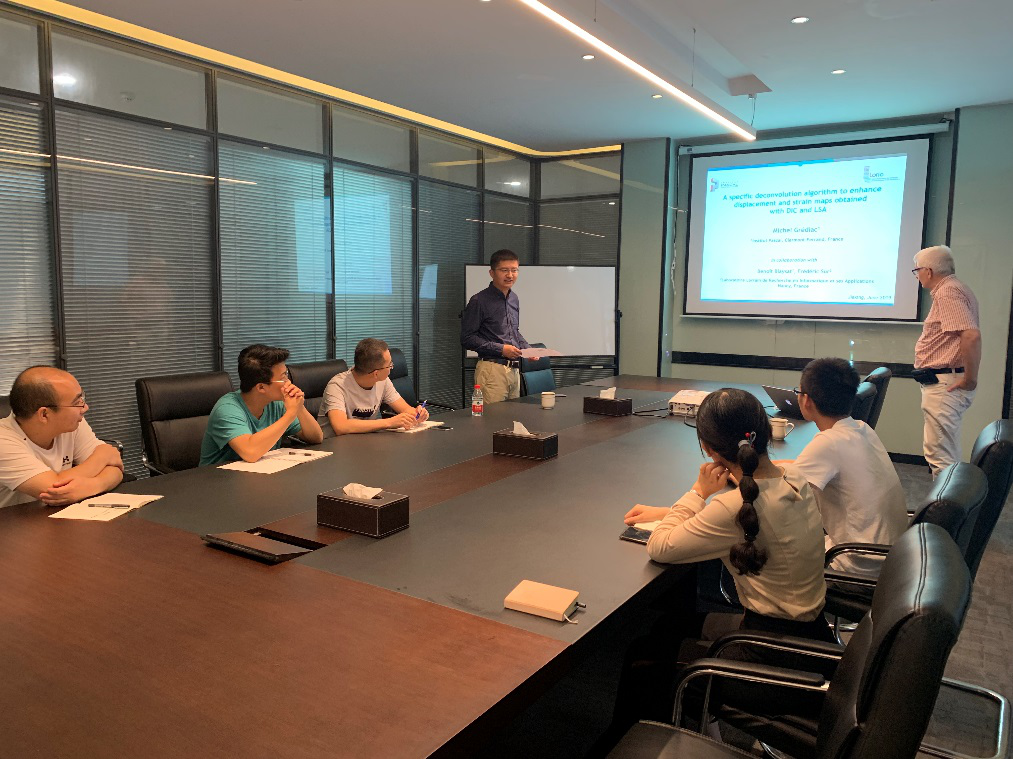 6月26日上午,GREDIAC教授給柔性光學測量技術研究所和我院相關方向研究人員(yuán)做了題為“一種提升數字圖像相關和局部頻譜分析(xī)法獲取位移和應變場質(zhì)量的反卷積算(suàn)法”的學術報告,報告主要介紹了他在變形測量理論方麵取得的最新成果:采用反卷積理論(lùn)來提高局部頻譜分析法的(de)變形分析精度。報告後,與會人員與Michel GREDIAC教授就試樣表(biǎo)麵結構製備、隨機(jī)散斑與規則網格/棋盤格在變形分析(xī)中的優缺點、反卷積方(fāng)法提高變形分析精度的本質等問題進行了深入交流討論。